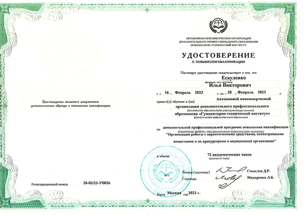 Удостоверение о повышение квалификации по программе "Организация работы с наркотическими средствами, психотропными веществами и их прекурсорами в медицинской организации" 2023 год